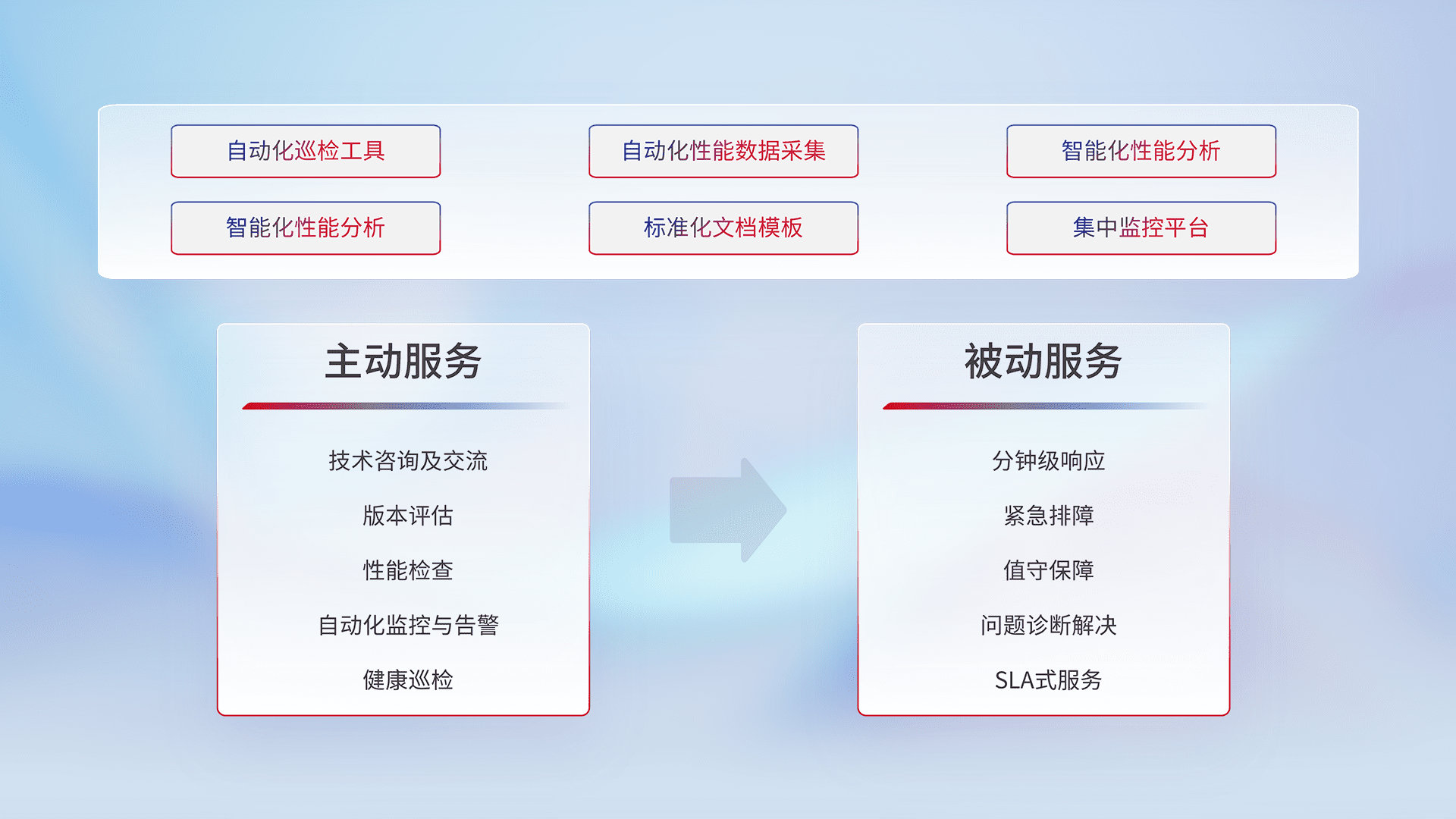 智能化工具和标准化文档,,,,保障服务质量,,提供主动服务(包含技术咨询、、、、版本评估、、、性能检查、、自动化监控与告警、、、、健康巡检)和被动服务包含(分钟级响应、、、紧急排障、、、值守保障、、问题诊断解决、、SLA服务)。。。